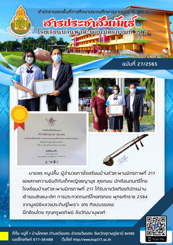 นายจเร หนูปลื้ม ผู้อำนวยการโรงเรียนบ้านหัวสะพานมิตรภาพที่ 217 ขอแสดงความยินดีกับเด็กหญิงชญานุช สุขเกษม นักเรียนดนตรีไทยโรงเรียนบ้านหัวสะพานมิตรภาพที่ 217 ได้รับรางวัลเกียรติบัตรผ่านเข้ารอบชิงชนะเลิศ การประกวดดนตรีไทยศรทอง พุทธศักราช 2564 จากมูลนิธิหลวงประ