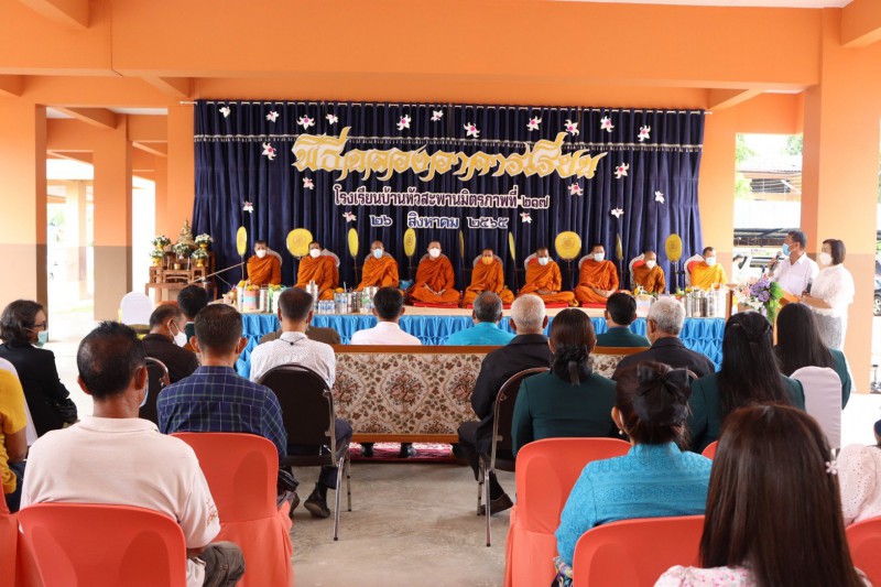 วันที่ 26 สิงหาคม 2565 โรงเรียนบ้านหัวสะพานมิตรภาพที่ 217 คณะกรรมการสถานศึกษาขั้นพื้นฐาน คณะครูและบุคลากรทางการศึกษา และตัวแทนนักเรียน ได้ดำเนินกิจกรรมพิธีฉลองอาคารเรียน (อาคารเฟื่องฟ้า) ถวายภัตตาหารเช้าแด่พระภิกษุสงฆ์ จำนวน 9 รูป เพื่อเป็นสิริมงคลและเป็น