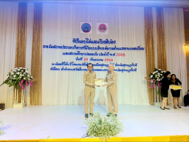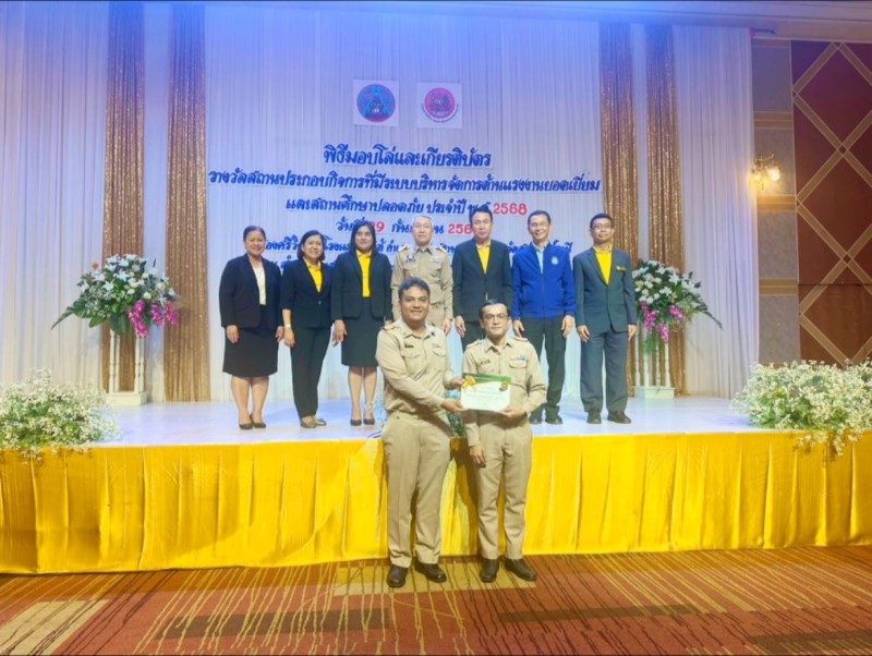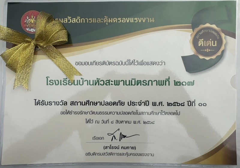 วันที่ 29 กันยายน 2568 โรงเรียนบ้านหัวสะพานมิตรภาพที่ 217 นายจเร หนูปลื้ม ผู้อำนวยการโรงเรียน มอบหมายให้นายกุลวิชญ์ ตันจะโข รองผู้อำนวยการโรงเรียน พร้อมด้วยนายนวกิต เกื้อฉิม ครูผู้รับผิดชอบกิจกรรม เข้ารับรางวัล "สถานศึกษาปลอดภัย ประจำปี พ.ศ. 2568 ดีเด่น
