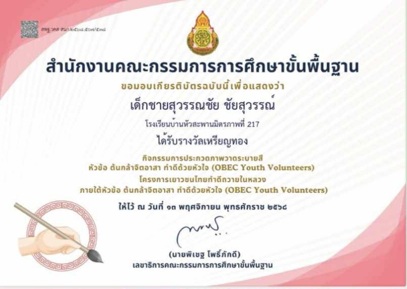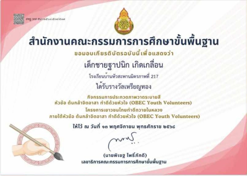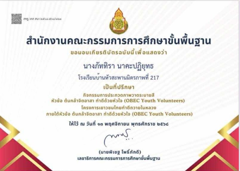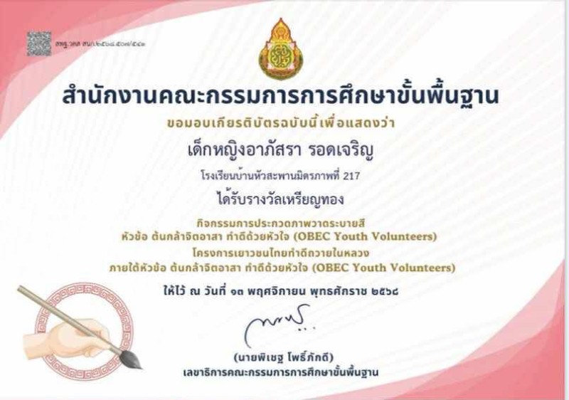โรงเรียนบ้านหัวสะพานมิตรภาพที่ 217 ขอแสดงความยินดีกับนักเรียนและครูที่ปรึกษา 1. เด็กหญิงศิริณพัชร ค้ำวงค์ 2. เด็กหญิงอาภัสรา รอดเจริญ 3. เด็กหญิงฐานิภา สังวาลสิน 4. เด็กชายสุวรรณชัย ชัยสุวรรณ์ 5. เด็กชายฐาปนิก เกิดเกลื่อน ??นางภัททิรา นาคะปฏิยุทธ ครูที