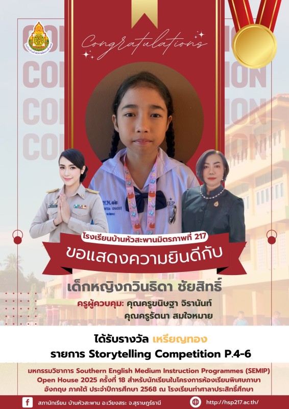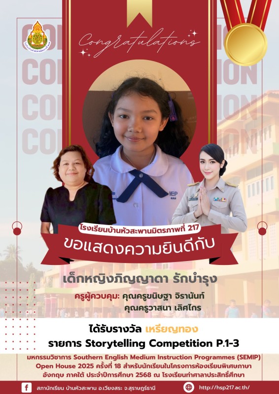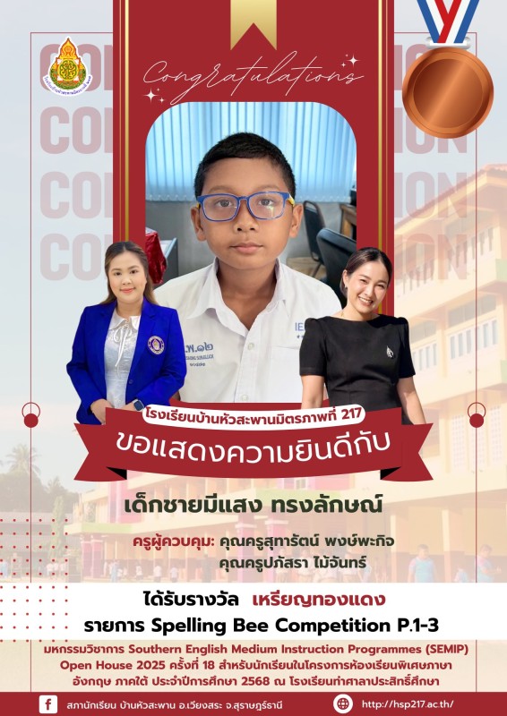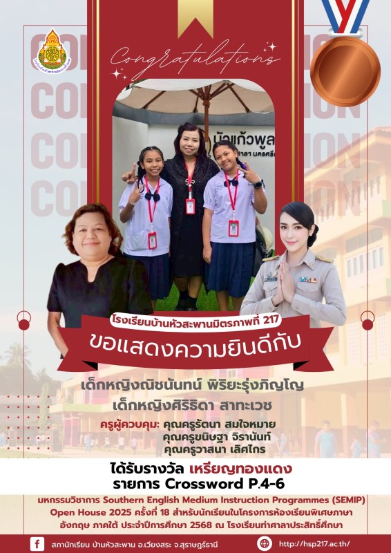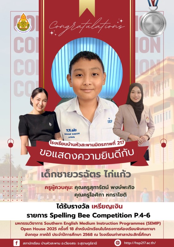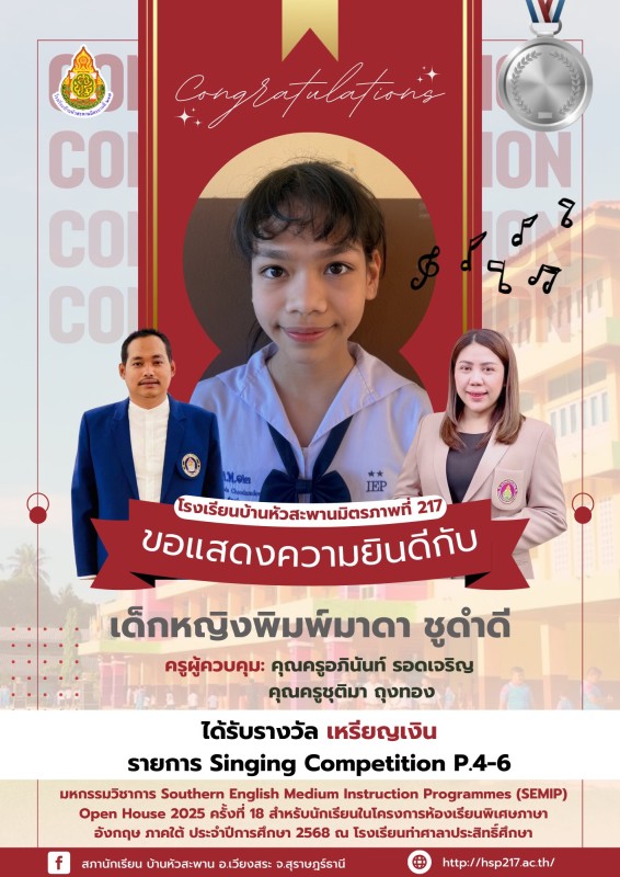 ขอแสดงความยินดีกับนักเรียนคนเก่ง โรงเรียนบ้านหัวสะพานมิตรภาพที่ 217 ขอแสดงความยินดีกับนักเรียนที่เข้าร่วมแข่งขันและได้รับรางวัล จากการเข้าร่วม มหกรรมวิชาการ Southern English Medium Instruction Programmes (SEMIP) Open House 2025 ครั้งที่ 18 สำหรับนักเรียน